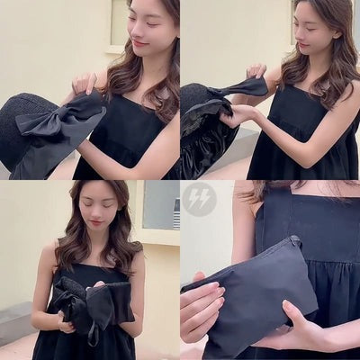 O chapéu não só oferece proteção solar e estilo incomparável, mas também vem com um detalhe funcional: um laço que se transforma em uma prática bolsa.
