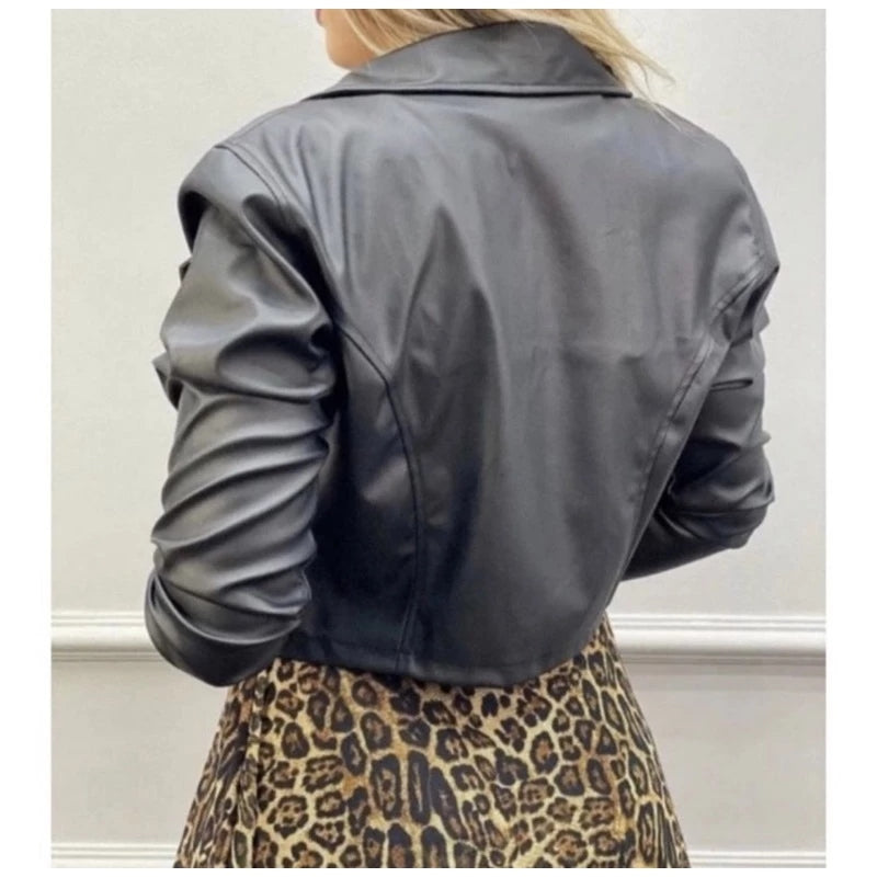 A textura suave e o brilho discreto do couro ecológico tornam a jaqueta uma escolha elegante e sustentável para o inverno.